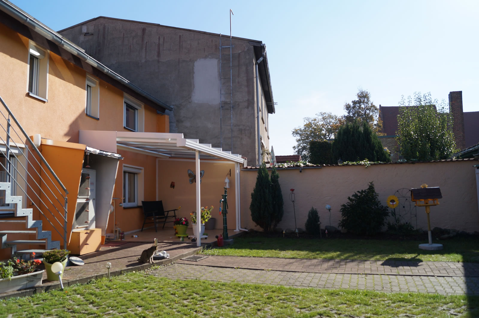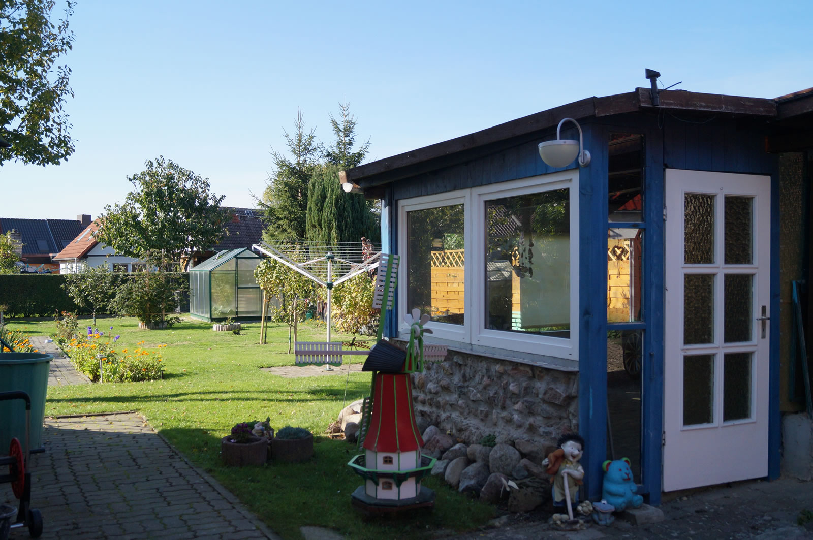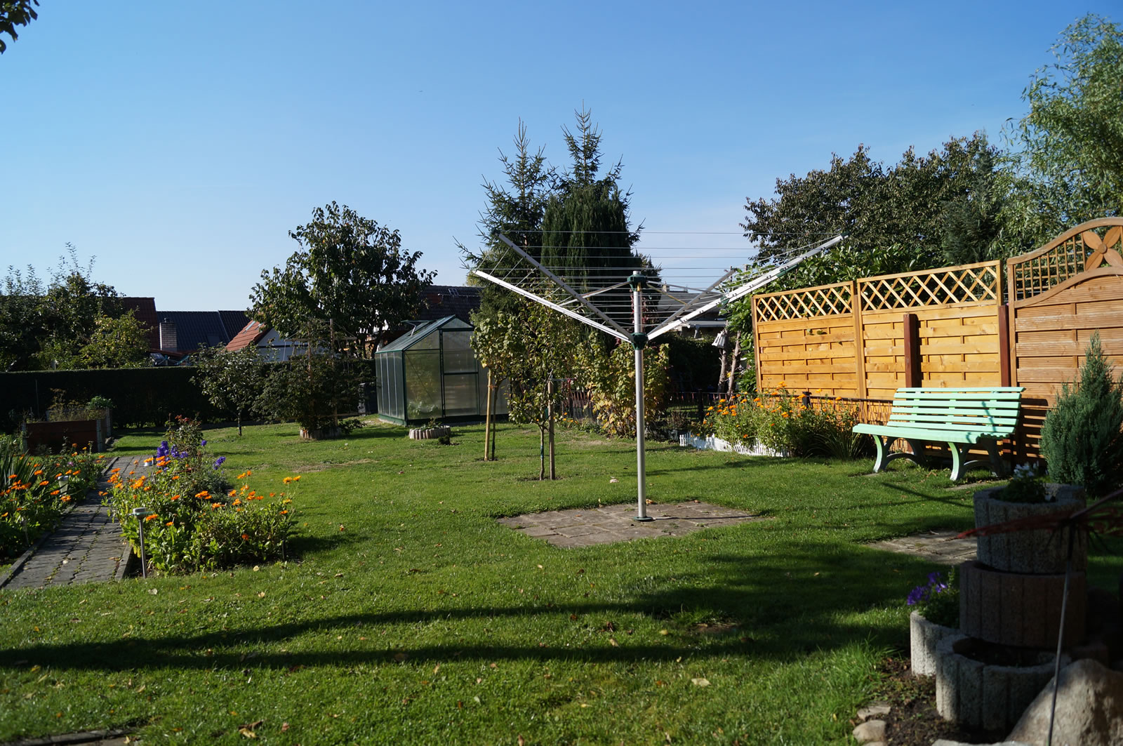 Zur Wohnung gehört eine kleine Außenterrasse. Im Garten steht den Gästen ein Platz zum Grillen und Sonnen zur Verfügung. Gartenmöbel und Grill sind vorhanden.